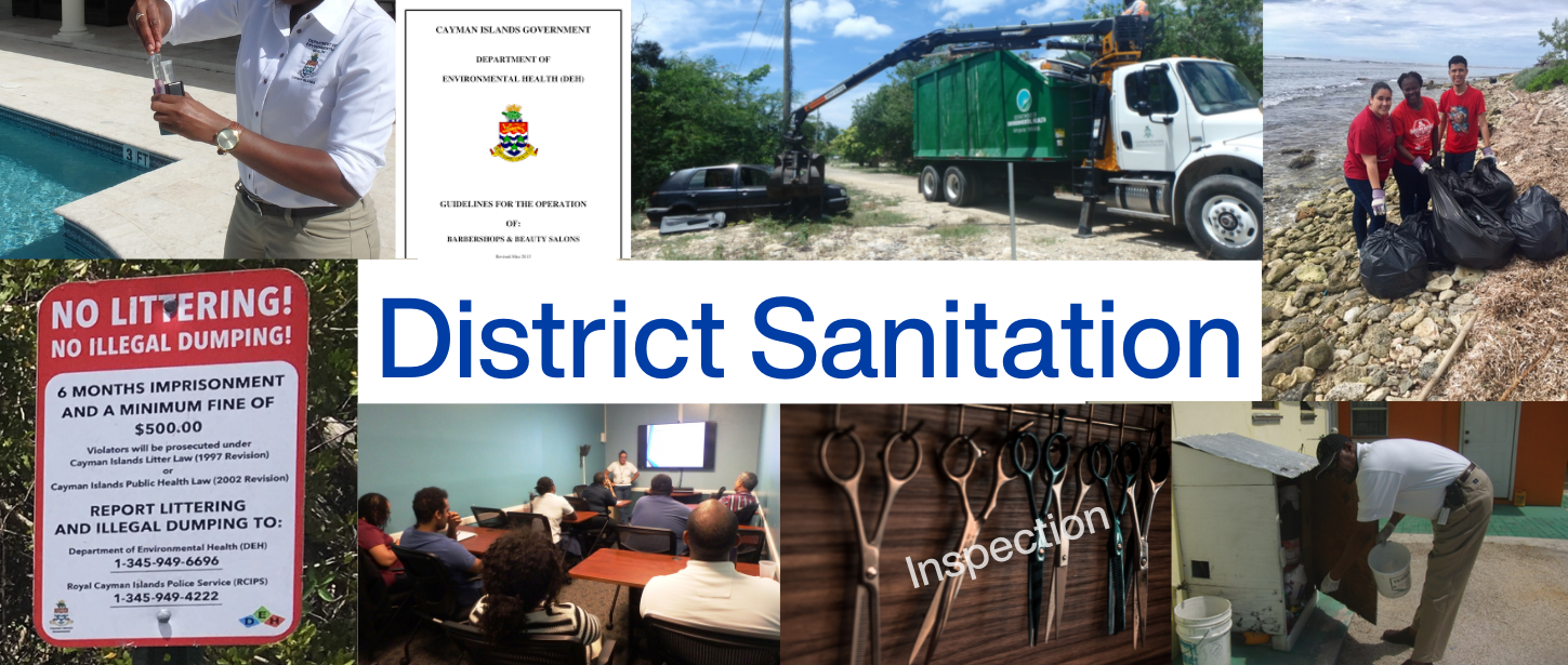 The Environmental Health Officers (District) identify and ensure that environmental related issues that may be prejudicial to health are prevented or addressed in a timely manner in order to ensure a safe environment in the Cayman Islands. The focus is prevention and also the adoption of measures to avoid any nuisance/condition that may be harmful to health as a result of activities in the following areas: