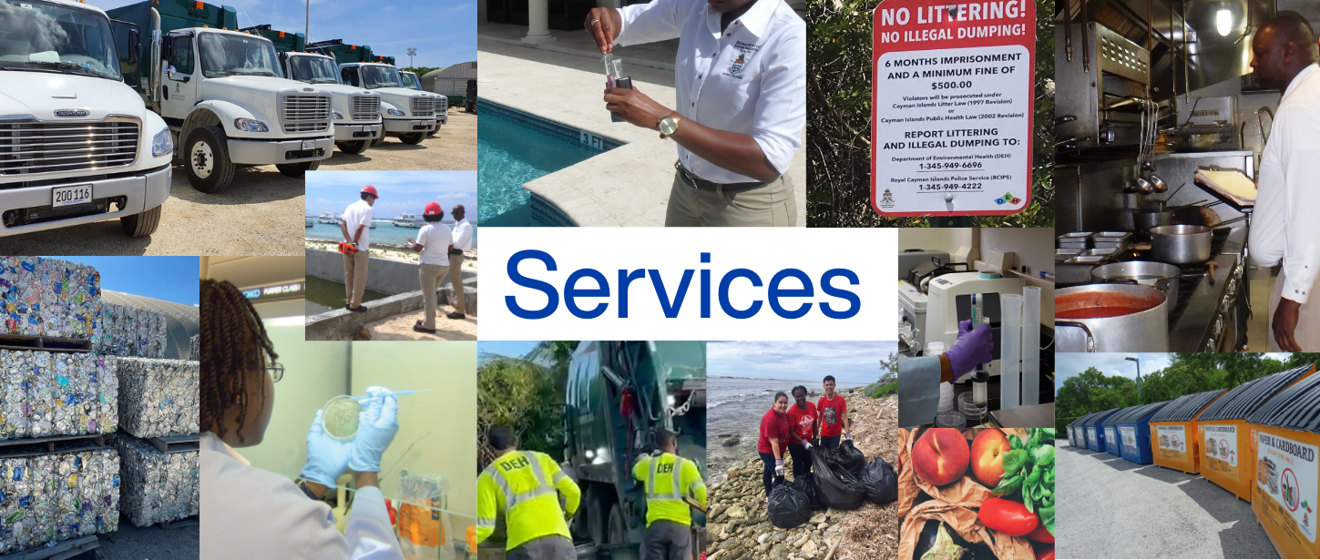 The Department of Environmental Health (DEH) provides services to allow responsible management and recycling of solid waste materials generated by the public and commercial businesses in the Cayman Islands. These services are generally located at the landfills located on each island.